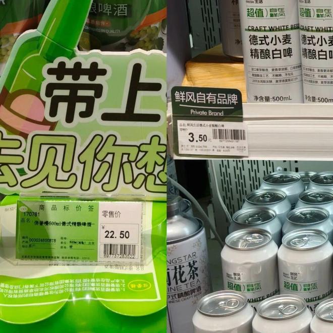 还有很常见的商超自营精酿啤酒,信誉楼自营的500ml*6一组的德式精酿啤酒售价22.5元,单价约3.75元;相比之下,胖东来DL德式小麦白啤500ml一瓶3.9元、鲜风生活超值德式精酿小麦啤酒500ml一瓶3.5元。