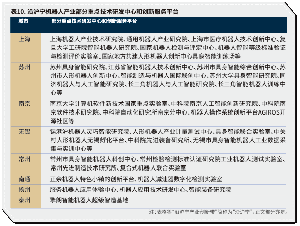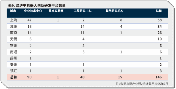 创新平台多为企业技术中心,可见企业是机器人研发主力。工程研究中心(40个)和其他研究机构(15个)为重要补充,重点实验室仅1个,说明高端原创科研资源仍相对稀缺。上海共有58个研发机构,在企业自主研发和产业创新上具有绝对优势。苏宁以企业技术中心和工程研究中心为主,体现企业与科研协同能力。其他城市的研发平台数量有限,主要依托合作或引入外部研发资源(表9-表10)。
