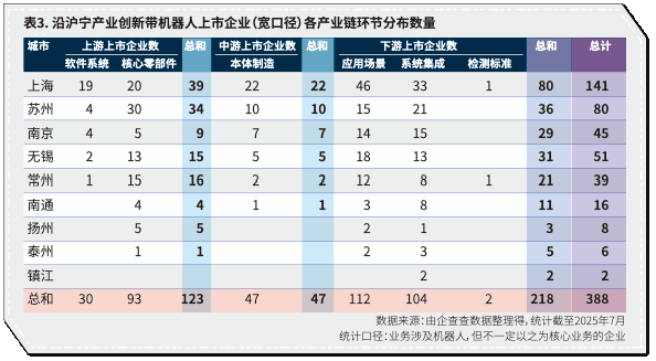 沿沪宁产业创新带上游与下游企业数量较多,中游企业较少。上游的核心零部件因与软件开发与电子制造、人工智能、物联网等既有优势产业高度相关,原有企业较容易向机器人业务转型;位于中游的机器人整机设计与制造,由于涉及复杂系统集成、精密机械、电控及软件协同等技术,对研发能力、生产能力要求高,企业进入门槛高,数量相对较少,多为以机器人为核心业务的新企业;下游系统集成与应用部署环节依赖多样化的应用场景,需求广泛且分散,企业多应用成熟技术,进入门槛低、模式灵活,数量较多。