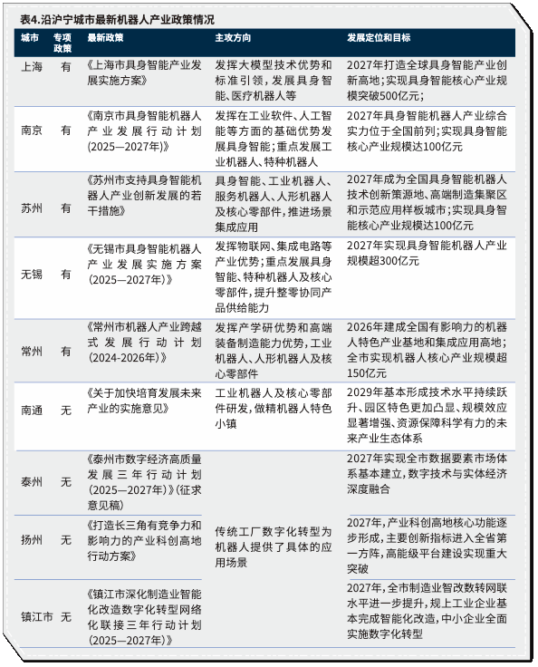 这种协同分工关系的特点是:上海大模型技术引领具身智能,南京工业机器人,苏州服务机器人,无锡精密电子制造,常州电池电机,南通机器人小镇,其他地区蕴藏广阔应用场景潜力。前五个城市在近两年都发布了机器人产业的专项产业政策,将长期支持机器人产业的战略发展(表4)。其余城市着力打造特色化机器人产业基础,发挥延链补链作用,并在养老、教育、公共事业及工厂转型升级等领域孕育着广阔的应用前景。
