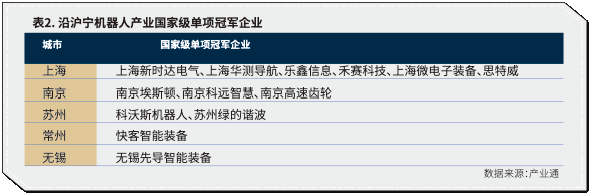 沿沪宁产业创新带的机器人企业整体质量较高,上海在龙头企业方面优势突出。沿沪宁拥有全国21.9%的机器人企业,却有25.5%的科技型中小机器人企业,22.6%的高新技术机器人企业,23.9%的机器人上市公司。上海有6个国家单项冠军企业,优势集中在集成电路、人工智能开发和系统集成环节;南京和苏州分别有3个和2个国家单项冠军企业,优势集中在工业机器人和服务机器人整机制造和关键零部件上;常州和无锡各拥有1家国家级单项冠军企业,优势在精密电子加工和电池电器等关键零部件环节(表2)。