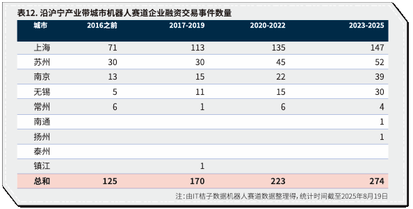 近年来沿沪宁机器人企业融资数量提升(表12)。2016年-2025年,企业融资交易事件数量总量从125起增至274起。资本高度集中在上海,融资交易事件数量比其他城市总和还多20起。苏州、南京和无锡紧随其后,显示区域龙头和增长梯队格局。中小城市融资事件有限,如常州、南通、扬州和镇江,仅零星发生。