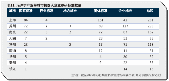 近年来沿沪宁机器人标准制定较为活跃,上海和苏州贡献了近六成标准。比如,2023年,苏州成立机器人产业标准化联盟,首批启动9项团体标准研制。2024年,上海市市场监管局推动《智能机器人智能化等级评价规范》地方标准制定,由上海机器人产业技术研究院牵头。上海的突出优势在于国家标准(84项)和团体标准(151项),这不仅体现了其产业协同组织能力,也折射出其在全国机器人行业中“引领规则”的话语权。苏州则以企业标准(127项)见长,可见企业活跃度高、创新意愿强。
