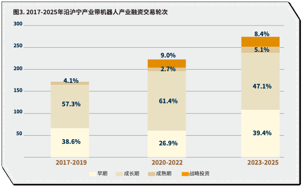 早期投资和战略投资增长快,资本更“天使”、更“耐心”。当前沿沪宁机器人产业投资主要聚集在成长期融资(A轮-C轮),但2023年以来资金早期投资(前A轮)占比增加显著,说明资本对于前沿技术和初创项目的关注度增强,更愿意在核心零部件、基础算法、具身智能等“卡脖子”环节提前下注,推动产业源头创新。