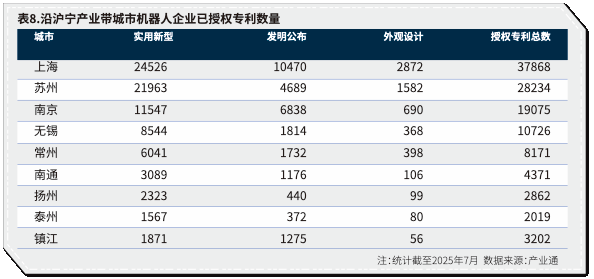 沿沪宁创新要素高度聚集,七成机器人授权专利由苏沪宁提出(表8)。上海研发与应用创新并重,各类专利数量远超其他城市;苏州专利以实用新型见长,突出工艺与应用层改进;南京在发明专利上优势明显,体现原创研发能力。无锡与常州专利集中在实用新型领域,创新以制造工艺和产品优化为主。南通、扬州、泰州、镇江整体规模有限,多为补充型角色。