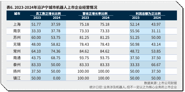 2024年沿沪宁机器人上市公司总体经营表现转弱,反映出行业快速扩张带来的结构性问题。相比2023年,2024年沿沪宁城市机器人产业在员工增长率、营收增速和利润增速上均呈放缓态势,利润率下滑尤为突出(表5)。澎湃研究所调研发现,主要原因包括:一是产业尚未规模化与标准化,企业产品多为技术验证型,研发与制造成本高;二是商业落地缺乏场景,部分企业忽视客户需求与市场竞争,产品定位模糊,利润难以增长;三是在资本驱动下,行业泡沫滋生,个别企业通过低价倾销维持融资前景。