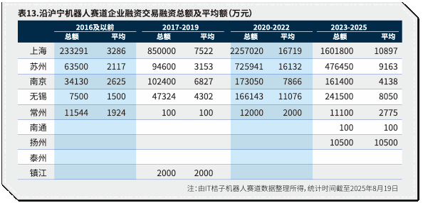 同时,2023年以来平均投资额度有所下降。2023年以前,沿沪宁机器人赛道处于高速发展期,政策、资本和市场对新兴企业关注度高,融资频繁且金额同步上涨。进入2023年后,尽管融资事件数量仍在上升,但资金集中度下降,融资总额和平均额下滑,可见资本趋于理性分散,投资人更注重项目质量与技术潜力,而非单纯押注少数头部企业的高额融资。资本正在通过“多点撒网”的方式培育产业生态,分散风险并推动更多潜力型企业成长。