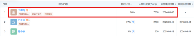 据天眼查披露的信息,温州盈晟实业有限公司注册成立于2016年9月14日,法定代表人为方步辰,而王德亮是在2024年9月才成为该公司的第一大股东。