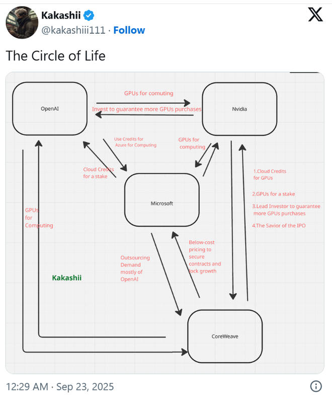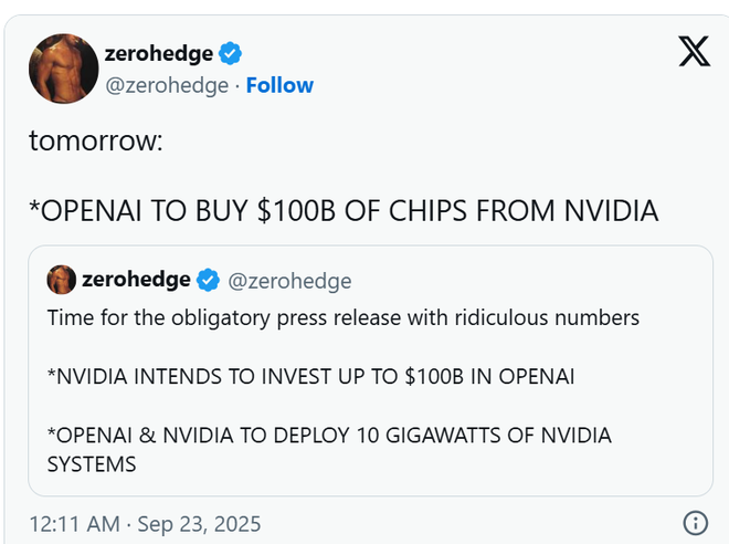 一家公司向另一家公司投资1000亿美元,这样它就可以购买“金主”生产的价值1000亿美元的芯片。欢迎来到人工智能的循环经济。