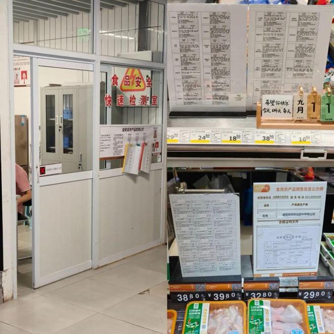 不过,北国超市在食材透明化与新鲜度保障上也有可圈可点之处:当日出清的寿司、现做炒菜等,会明确标注所用食材配料、生产日期与保质期;冷鲜肉产品通过“食用农产品销售信息公示牌”展示动物检疫合格证明、保存期限等信息;店内一角还设有食品安全快速检测室,强化消费信任。