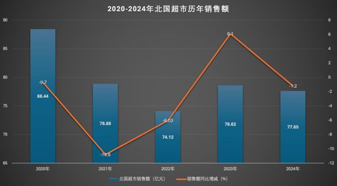 从近五年数据来看,北国超市始终稳居河北省内连锁超市榜首,门店数从2020年的47家稳步增长至2024年的65家;但销售额从2020年的88.44亿元波动下滑至2024年的77.65亿元,与省内第二名信誉楼的差距持续缩小。