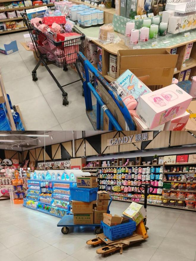 另外,笔者在工作日下午探店时还发现,部分货架间的狭窄动线区域散乱堆放着纸箱与购物车,部分运货叉车及纸箱也杂乱置于货架旁,进一步影响消费体验。