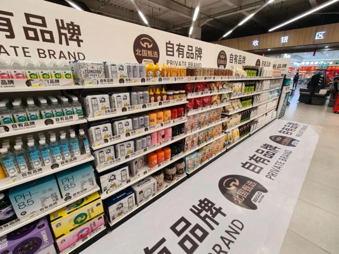在供应商选择上,北国超市更倾向于与河北省内的产品专家级企业合作,凸显区域商超的地域特性。但实探发现,其仅设有一处自营商品集中展示区,且该区域位于临近出口的不显眼位置,其余自营商品均按品类分散在不同货架,相关标识亦不醒目,未能有效引导消费。