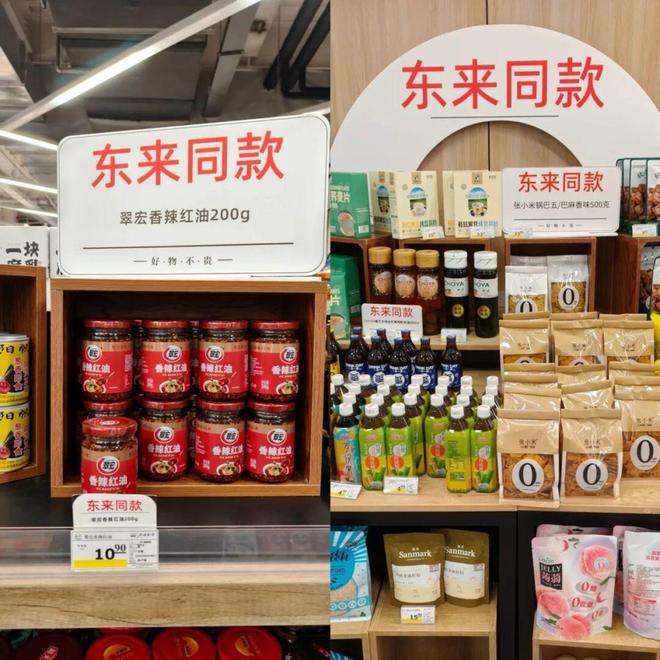 今年6月,永辉超市河北首家胖改店在石家庄长安万达广场开业,调改后该店商品结构与胖东来的相似度达80%。受此影响,北国超市内至少有十个货架陈列前贴有“东来同款”招牌,涵盖张小米锅巴、湘佳鲜禽、翠宏香辣红油等商品,试图贴近消费者对“高质价比”的需求。