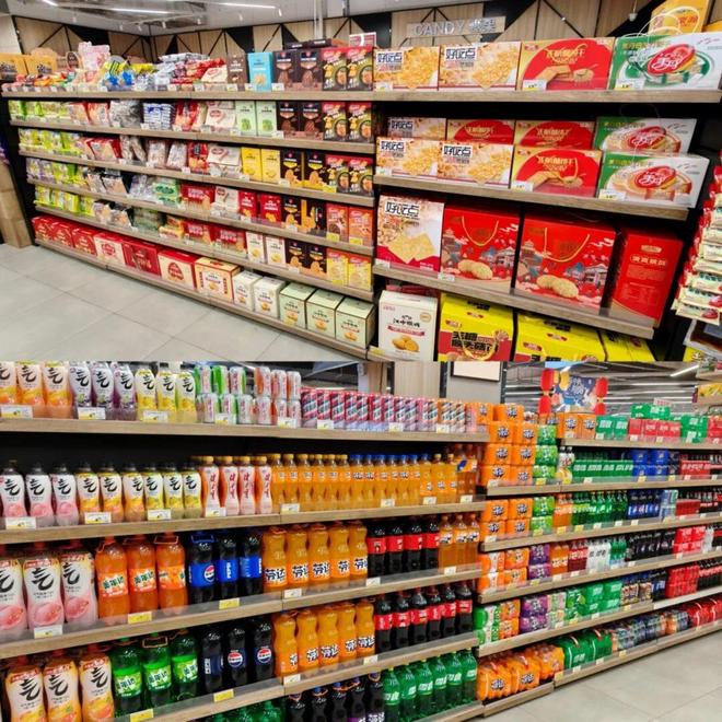 比如在一进入超市的酒水食品区,我们发现,货架上以可口可乐、百事可乐等常见大流通货为主,零食则聚焦雀巢、好吃点等传统品牌,年轻化、网红款选品并不多。