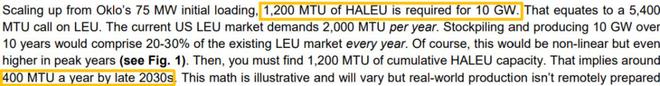 这意味着2030年代后期需达到400 MTU/年的供应量,当前产能规划与之相差约50倍。