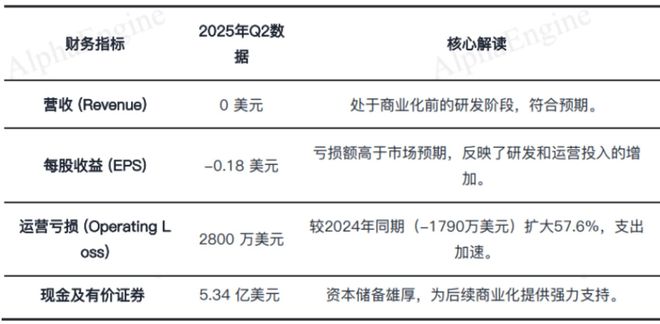 根据公司披露的25Q2财务报表显示,本季度运营亏损同比扩大至2800万美元,公司持有的现金及有价证券总额达到5.34亿美元,较上一季度(2.01亿美元) 大幅增长。
