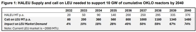 即使所有浓缩商按计划扩产、DOE提供增量支持,到2040年全球HALEU反应堆累计装机量仅能达到1-2GW,而OKLO当前估值隐含2040年10-20GW的运营规模,两者存在巨大差距。
