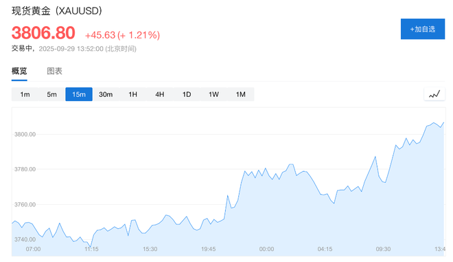 美国政府可能关门以及通胀数据加强美联储降息预期的共振影响,避险情绪及低利率环境提振金价,现货金上涨1.2%,至每盎司3,806.8美元。