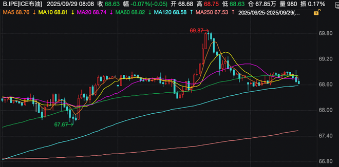 - 布油小幅下挫,下跌0.03%至每桶68.53美元。