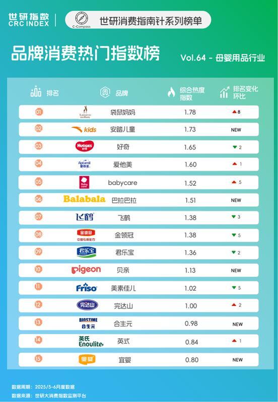 本次监测周期内,袋鼠妈妈、安踏儿童和好奇分别以1.78、1.73和1.65的综合热度指数位列榜单Top3。