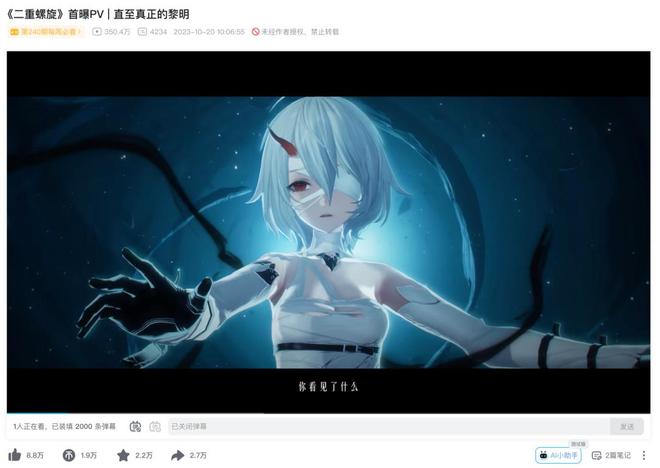2023年10月20日,《二重螺旋》发布首曝PV,其融合了高机动性、远近战自由切换的立体战斗玩法以及二次元蒸汽朋克美术风格,迅速吸引了大量关注,B站播放量当日即突破百万。