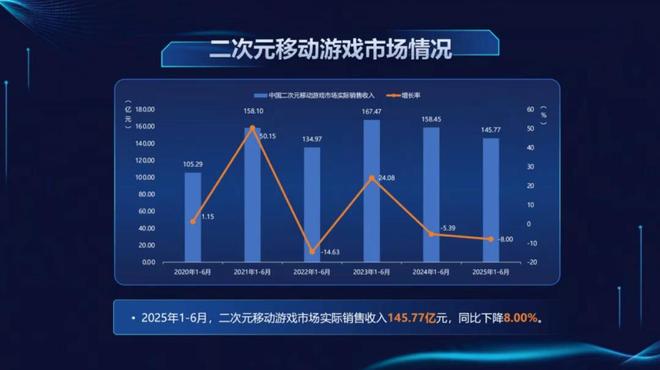 2024-2025年的二游市场,已从曾经的“流量蓝海”演变为“竞争红海”。根据游戏工委报告,2025年上半年二次元移动游戏市场收入同比下降8%,连续两年呈现下滑态势。市场呈现出明显的“马太效应”:头部产品占据大部分收益,而中小厂商的生存空间被不断压缩。