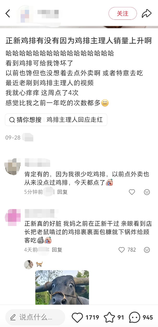 “正新鸡排有没有因为鸡排主理人销量上升?” 有网友在小红书发帖称,因频繁刷到“鸡排哥”的视频,自己一周内竟点了四次正新鸡排,“比过去一年加起来还多”。评论区不乏共鸣声,有人称连吃三天,也有人因被视频勾起馋虫而直接下单外卖。