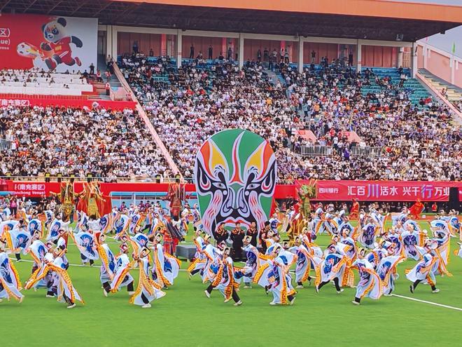 陈小涛在中场秀时再度登场,领衔300余位演员共同演绎了他的经典歌曲《变脸》。他融合川剧与流行元素的独特唱腔,与赛场上的欢呼声交织成最动人的旋律。