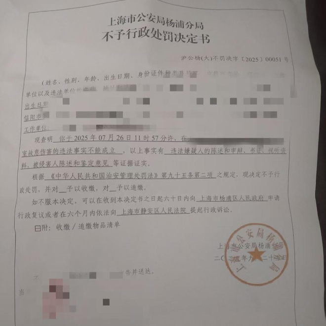 上海市公安局杨浦分局9月20日下达的《不予行政处罚决定书》显示,警方认为,本案“故意伤害的违法事实不能成立”,对何阿姨不予行政处罚。