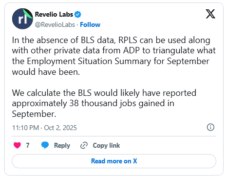 美国政府关门导致劳工统计局暂停发布非农就业数据之际,私人数据提供商Revelio Labs报告(RPLS)显示,9月份美国新增就业岗位6万个,为2025年最佳。这一数据远超此前ADP报告的负3.2万个岗位流失,有效缓解了市场对劳动力衰退的担忧。