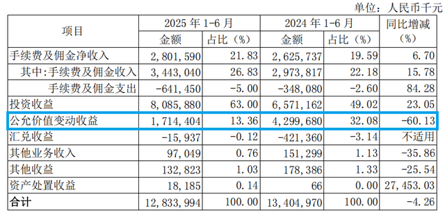 值得注意的是收入结构的"偏科"。2025年上半年,南京银行的非利息净收入为128.34亿元,同比减少5.71亿元,同比下降4.26%。其中,公允价值变动收益约为17.14亿元,同比暴跌60.13%,这与银行业非息收入整体7.01%的增速形成鲜明反差。