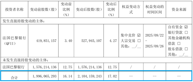此后多年,经过几轮增持,截至2025年9月28日,法国巴黎银行及法国巴黎银行(QFII)持有的南京银行股权已经增至17.02%。