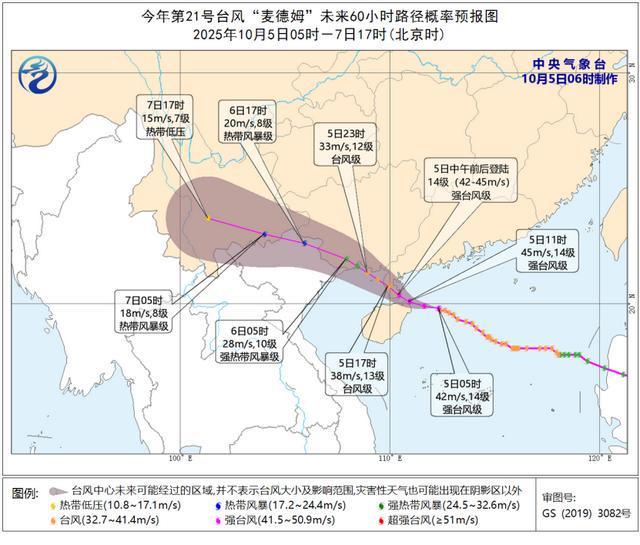 大风预报:10月5日08时至6日08时,南海西北部和中西部海域、东沙群岛、西沙群岛、北部湾、琼州海峡、广西南部及沿海、广东南部及沿海、海南岛及沿海将有6-8级、阵风9-10级的大风,其中,南海西北部海域、琼州海峡、北部湾北部海域、广东雷州半岛及沿海、广西沿海、海南岛东部和北部沿海的风力有9-11级、阵风12-13级,部分海域或地区风力可达12-14级,阵风15-16级。
