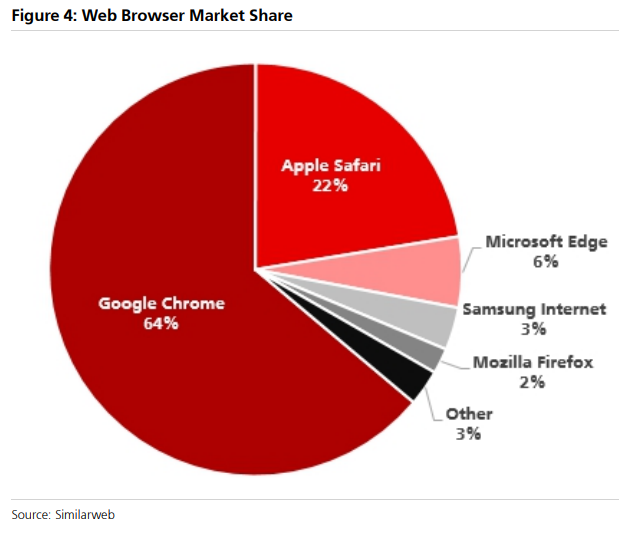 瑞银表示,目前网络浏览器市场由谷歌Chrome主导,其次是苹果Safari和微软Edge。AI浏览器的出现正在颠覆这一相对稳定的格局。
