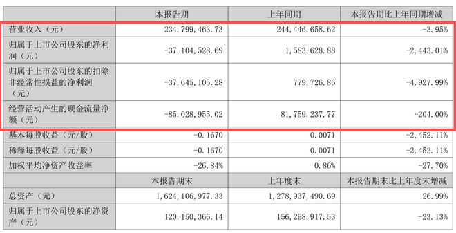 2025年上半年,公司营业收入为2.35亿元,同比下降3.95%;归母净利润为-3710.45万元,同比下降2443.01%;扣非归母净利润为-3764.51万元,同比下降4927.99%。