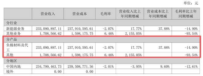 对于净利转亏,滨海能源解释称,上游石油焦、煅后焦等原辅料价格出现上涨,公司负极材料的出货价格稳定,毛利率相对降低。报告期内,公司“现金奶牛”负极材料及代工产品营业收入为2.33亿元,毛利率却下滑14.90%至-2.07%。