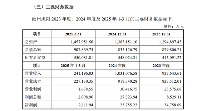 值得注意的是,沧州旭阳2023年度、2024年度及2025年1-3月的净利润分别为3.47亿元、2.37亿元、2111万元。2024年业绩,同比较2023年出现了较大幅度的下降。