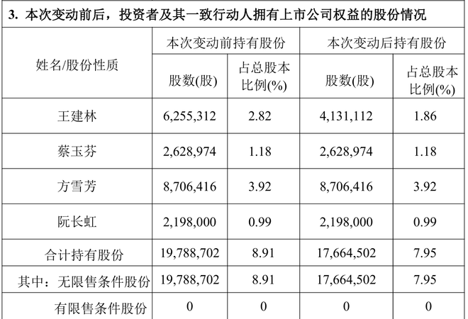公告披露,王建林及其一致行动人于本次权益变动前合计持股1978.87万股,占公司总股本的8.91%,本次权益变动后合计持股1766.45万股,占公司总股本的7.95%,变动触及1%刻度的整数倍。
