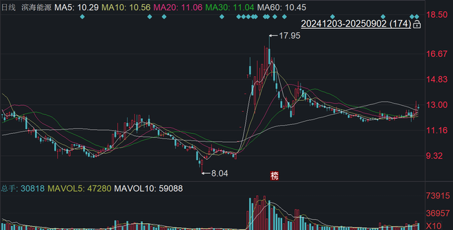 二级市场上,截至9月2日收盘,滨海能源下跌1.09%报12.72元/股,最新市值28.26亿元,今年来公司股价上涨约两成。