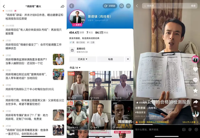 截至目前,鸡排哥的抖音账号涨粉至84万,他的过去、家人甚至胳膊上的烫伤疤最后都以热搜的方式被展现剖析。距离爆火不过十余天,鸡排哥已经快速经历了追捧、质疑、造谣仿冒等一系列素人走红的通用流程。