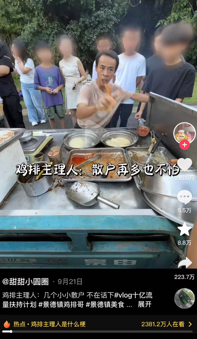 日前,鸡排哥荣获景德镇文旅推荐官,并在座谈会上承诺食品安全。当地还成立了工作专班、保洁专班等维持现场秩序。这一切都表明,至少在接下来一段时间里,鸡排哥不再只是一个单纯的小吃摊"主理人"。