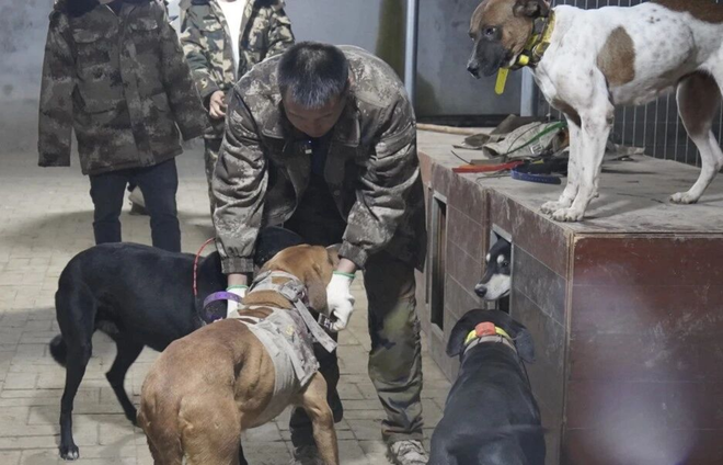吴志强正在给猎犬穿戴护甲