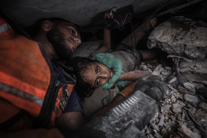 当地时间2025年9月16日,加沙城,以色列袭击了谢瓦广场的一个居民区,11岁的巴勒斯坦女孩马拉赫·哈达德被困在废墟下,经过近10个小时的努力,民防部队将其救出并送往浸信会医院接受治疗。视觉中国 图