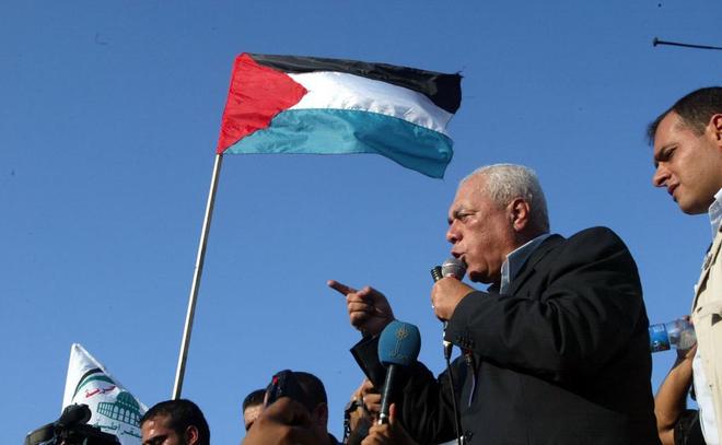2005年9月14日,在加沙地带南部的汗尤尼斯地区的原犹太人定居点内,巴勒斯坦总统府秘书长塔伊夫(右二)代表民族权力机构主席阿巴斯出席庆祝活动。新华社记者 王昊 摄