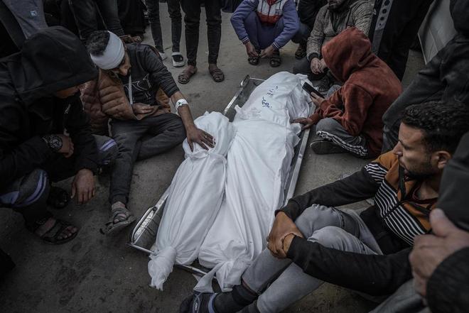 当地时间2023年12月26日,加沙地带汗尤尼斯,在亲人的尸体旁,人们哀悼。视觉中国 图