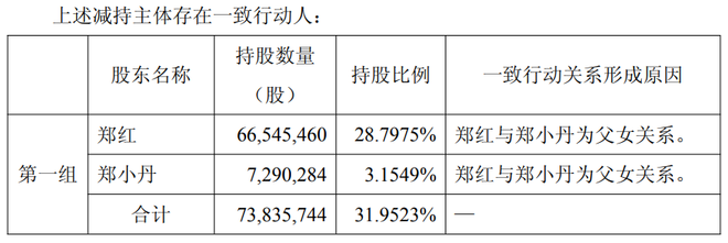公告显示,本次减持计划实施前,郑红持有公司股份66,545,460股,占公司总股本的28.7975%;郑小丹女士持有公司股份7,290,284股,占公司总股本的3.1549%。