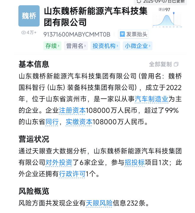 天眼查大数据显示,山东魏桥新能源汽车科技集团有限公司对外投资6家企业,共有企业风险信息232条。