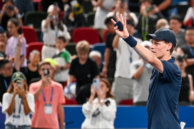 2025年10月4日,上海,久事体育场馆旗忠网球中心,比赛获胜后辛纳和观众挥手致意。澎湃新闻记者 朱伟辉 图