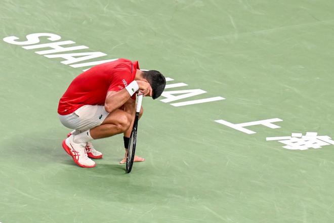 2025年10月7日,上海,久事体育场馆旗忠网球中心,输掉第二盘比赛后德约科维奇躺在场地上。澎湃新闻记者 朱伟辉 图